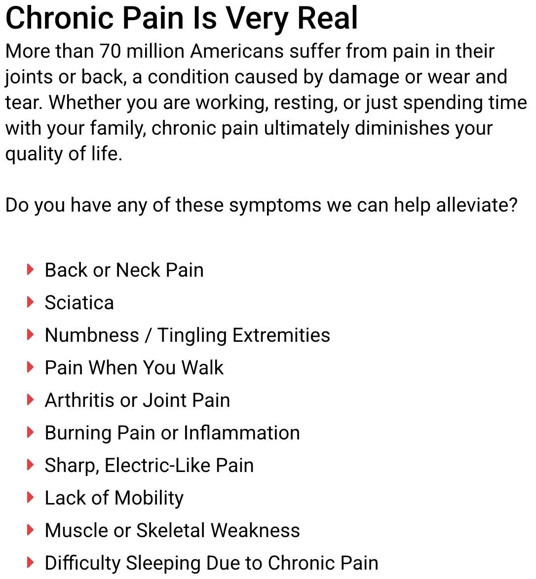Our Patients experience substantial decreases in pain, increased relief from nerve pressure, and diminished numbness and tingling. All of which is too common with decompression.